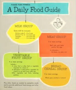By 1955, researchers at the Harvard School of Public Health condensed the 7 food groups into The Basic Four, which was adopted by the USDA. While being one of the federal government’s early attempts at messaging about tying diet to national stability, this and the guide that came before it lacked recommendations for appropriate choices of sugars, fats, and overall calorie intake.