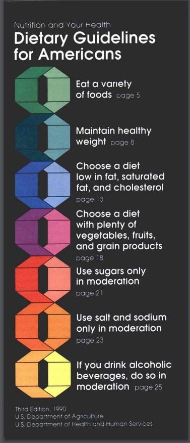 After reviewing evidence from sources such as the Surgeon General’s Report on Health Promotion and Disease Prevention, the American Society for Clinical Nutrition, and other scientific organizations, the task force presented its findings as the 1980 Dietary Guidelines for Americans, based on the prevailing scientific consensus about nutrition and its impact on health. From this point forward, the national Dietary Guidelines would be updated every five years, and this became law in 1990 with the passage of the National Nutrition Monitoring and Related Research Act. This law also requires all federal nutrition programs, including school meals, to be consistent with these nutritional guidelines.