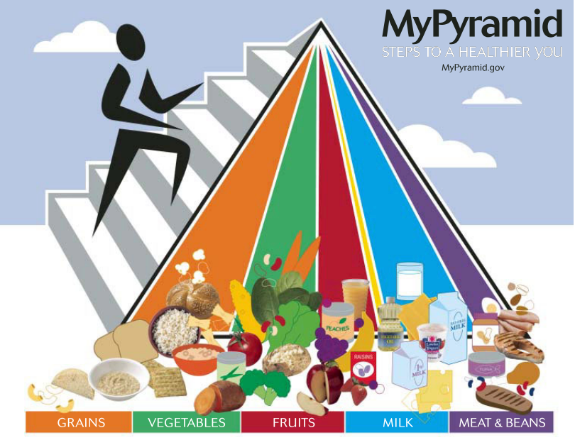 The Food Guide Pyramid then evolved into MyPyramid in 2005, which, with its tagline “Steps to a Healthier You,” further emphasized the importance of physical exercise by depicting a figure scaling the side of the pyramid.The bricks of the pyramid were changed into vertical wedges of color to reflect the DGA’s updated food patterns.