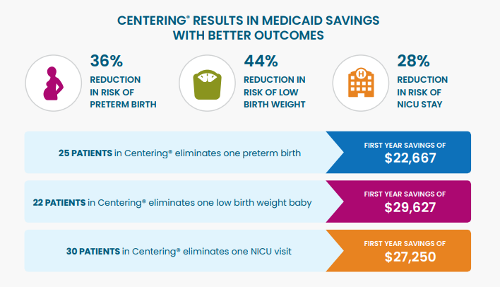 - Almost half of the births being financed by Medicaid, meaning the outcomes that Centering has proven to have can translate to cost savings for Medicaid